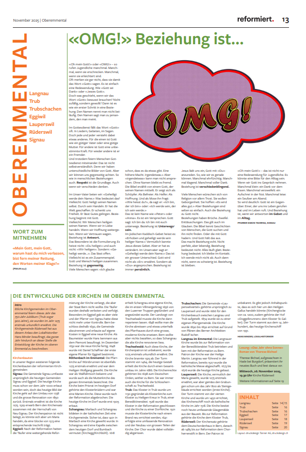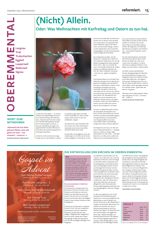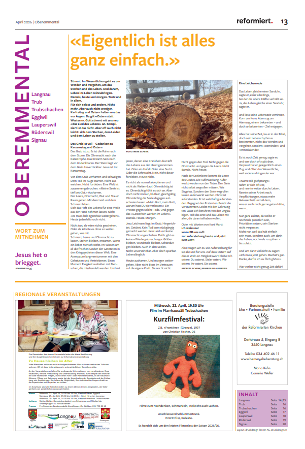 Auf dieser Seite können Sie alle Gemeindeseiten der Kirchenzeitung «reformiert.» nachlesen. Die PDF Dateien enthalten jeweils alle Gemeinden der Region Oberemmental. Um die Rüderswiler Seite zu finden, blättern Sie einfach nach unten.